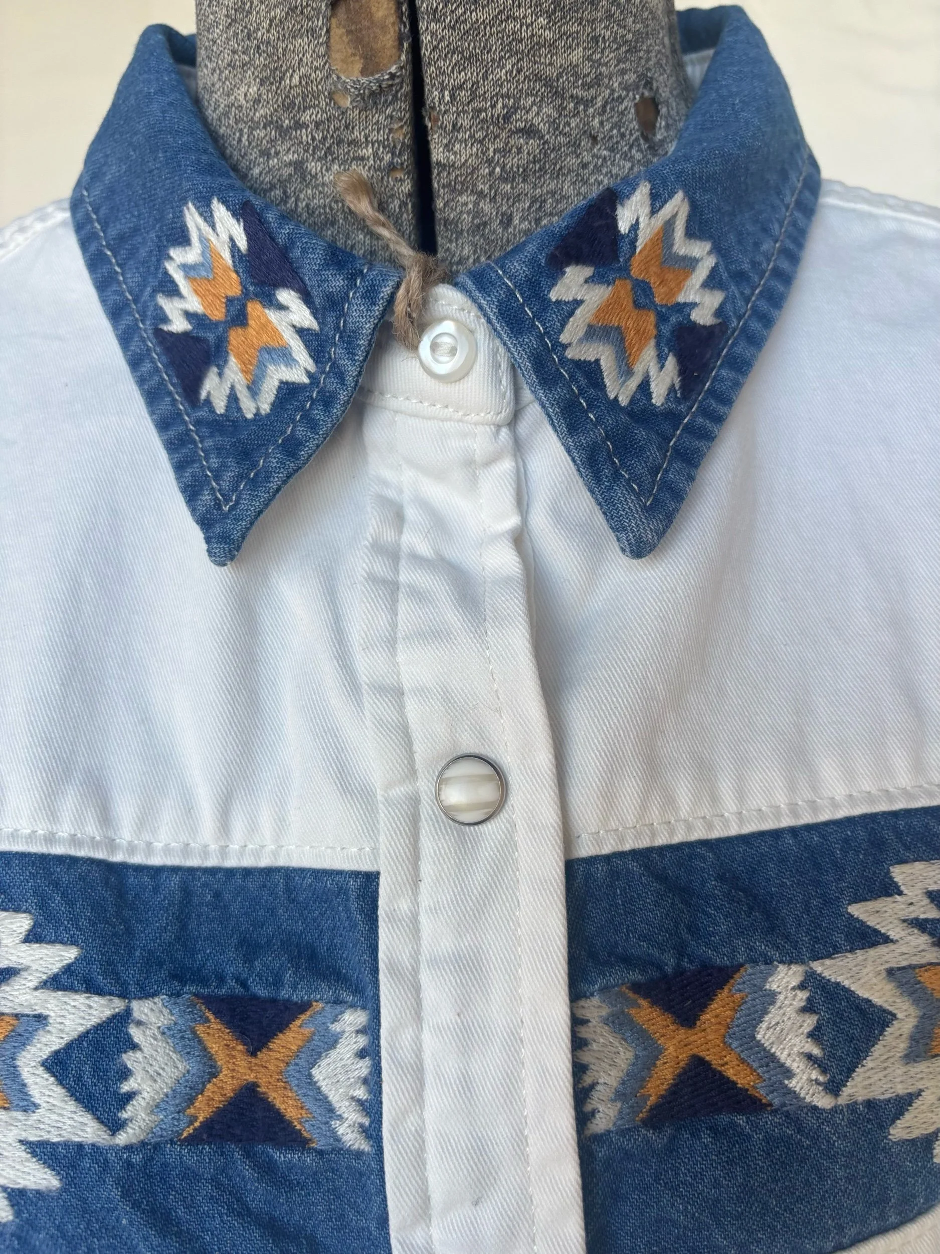 This Vintage wrangler pearl snap short sleeve is sure to turn heads ! Vintage, with embroidered designs, it’s unique and heirloom quality !